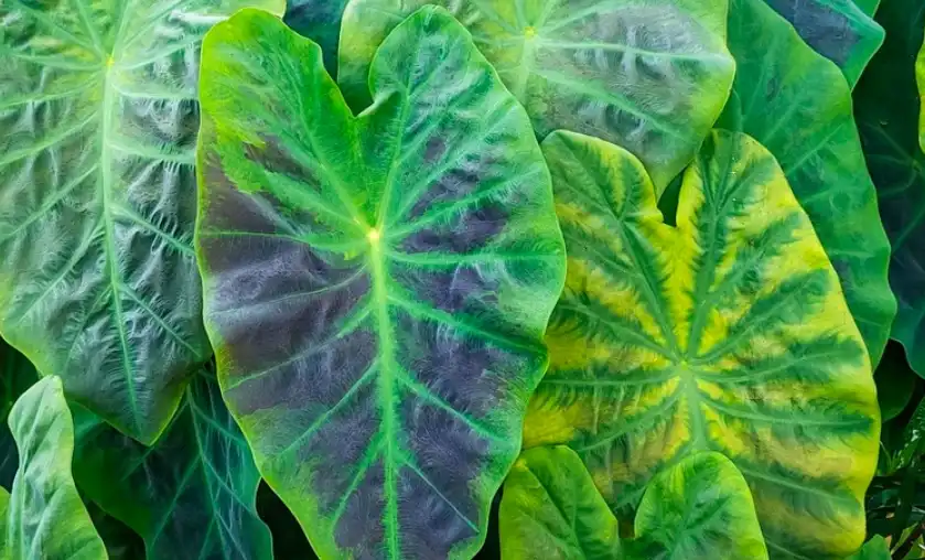 3. Colocasia esculenta ‘Mojito’: Una variedad llamativa con hojas verdes manchadas y salpicadas de negro púrpura, y pecíolos veteados. Es más compacta y muy popular para contenedores.